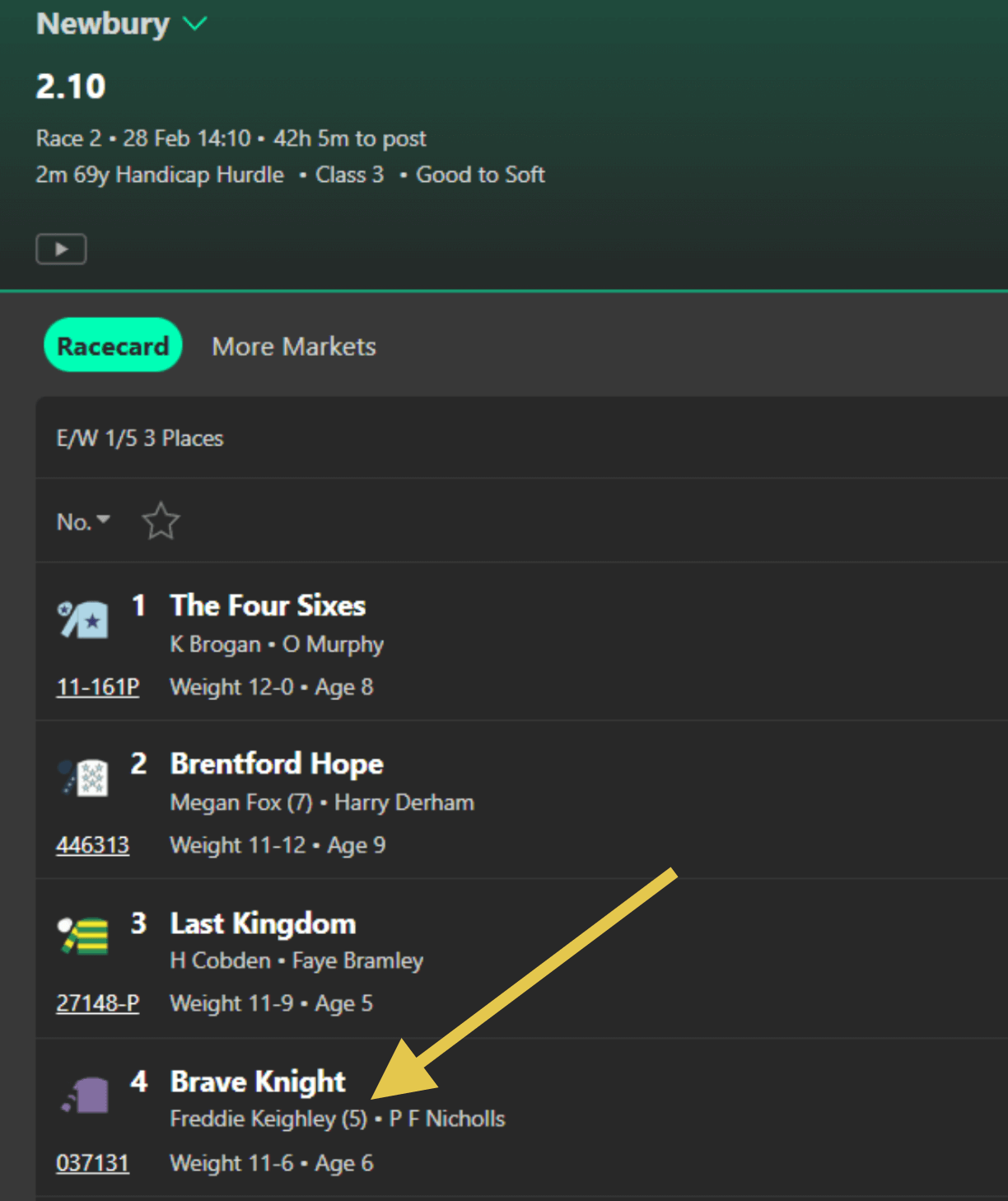 Note runners ridden by a 3lb or 5lb conditional jockey at Newbury. This means they get a weight advantage because of their jockey. You can find them like this: