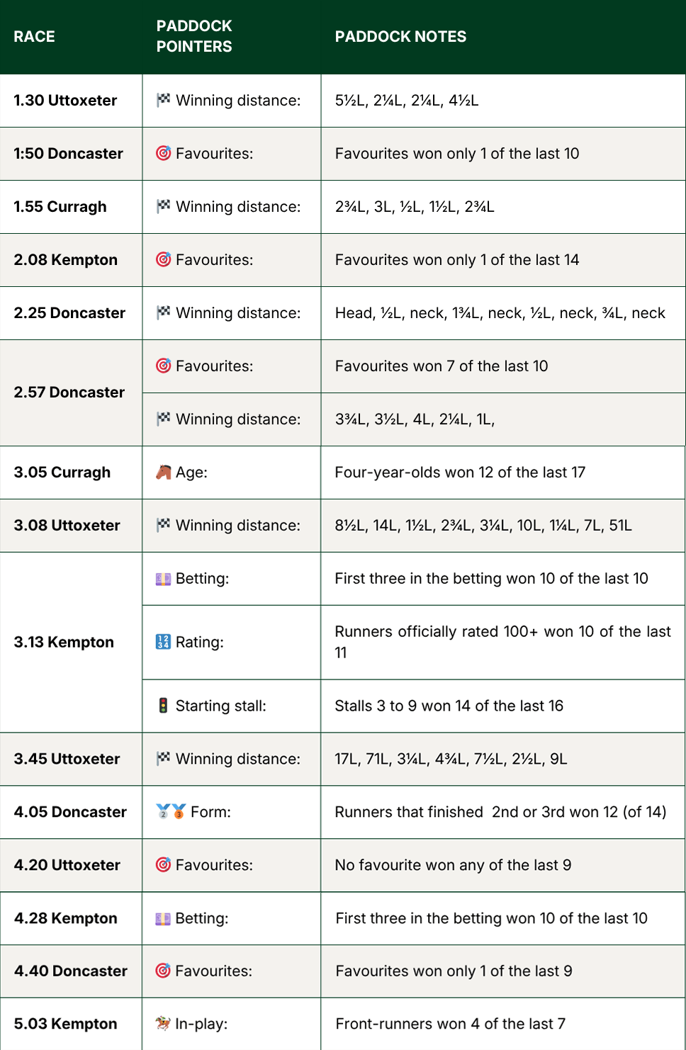 👉 At Doncaster’s two-day meeting, be wary of the first three in the betting. In the last five years at this very meeting, £1 placed on these runners returned a -£114 loss.